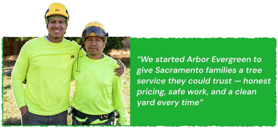 Arbor Evergreen is a family-owned tree service in Sacramento led by Jesus and his father. With deep local roots, they’ve built their reputation on three things: safety, honesty, and respect for every property they serve. Whether it’s hazardous tree removal near homes and power lines, land clearing for new projects, or emergency storm cleanup, their crew treats every job as if it were their own yard.